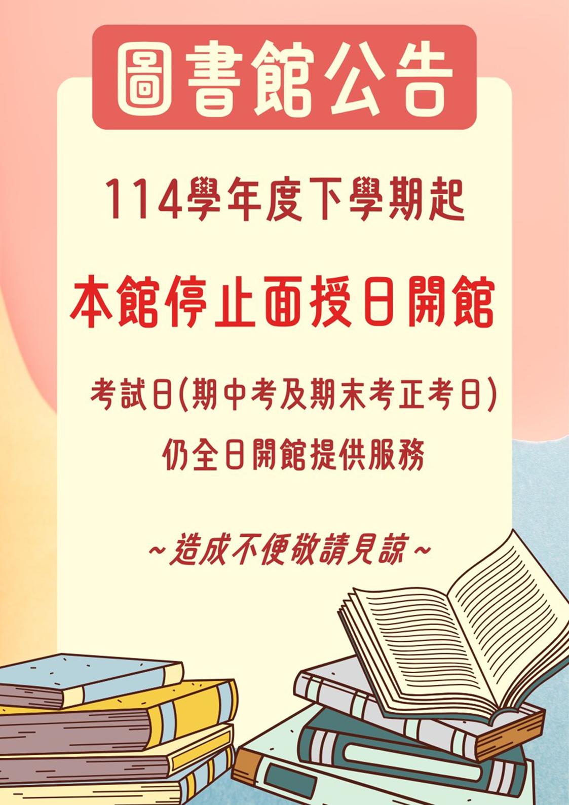 考量近年實體面授課程日趨減少,114學年度下學期起,校本部圖書館停止面授日開館,惟考試日(期中考及期末考正考日)仍全日開館提供服務。